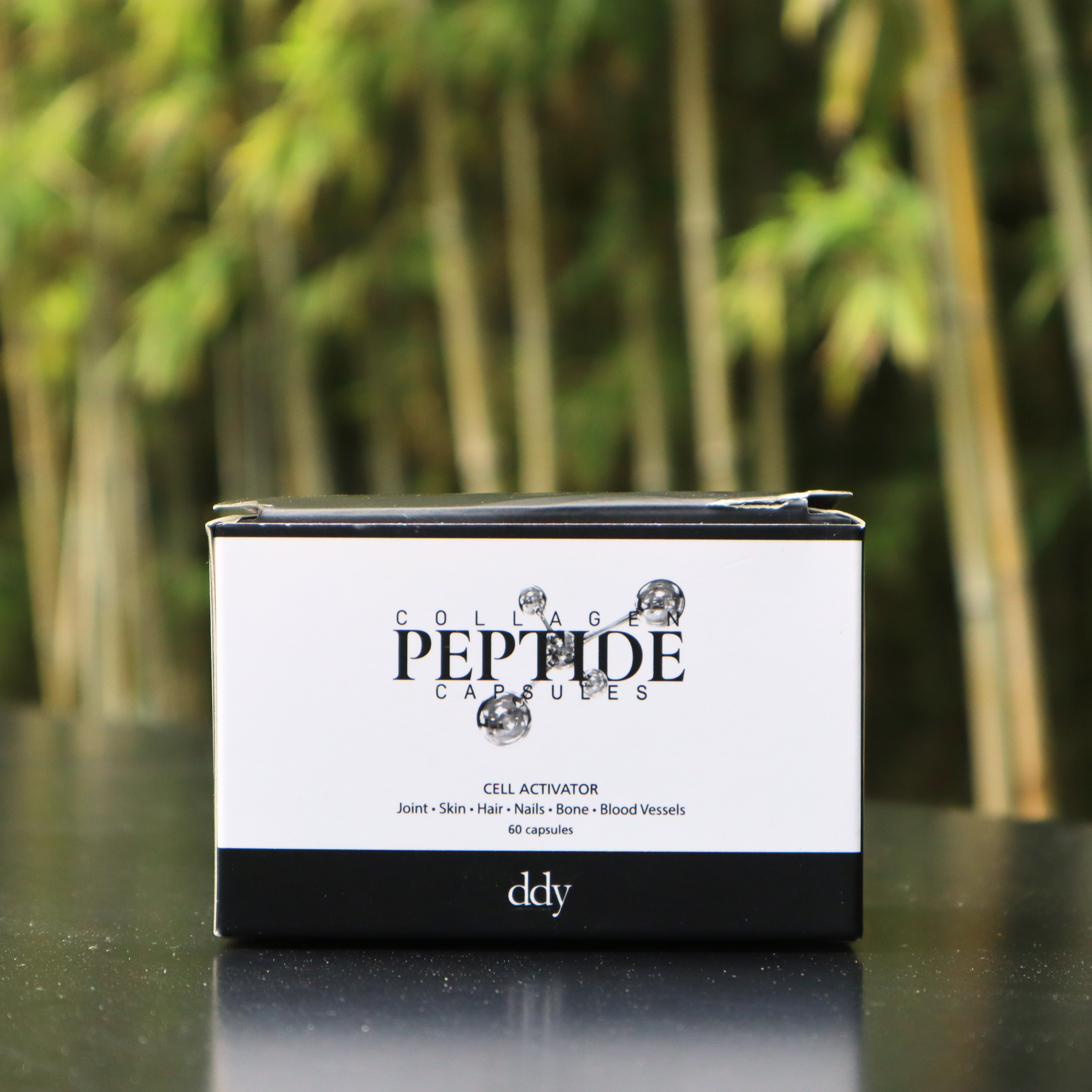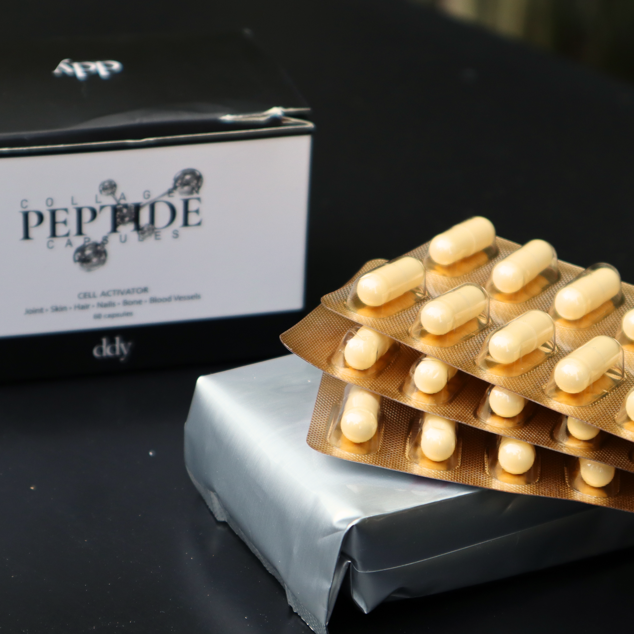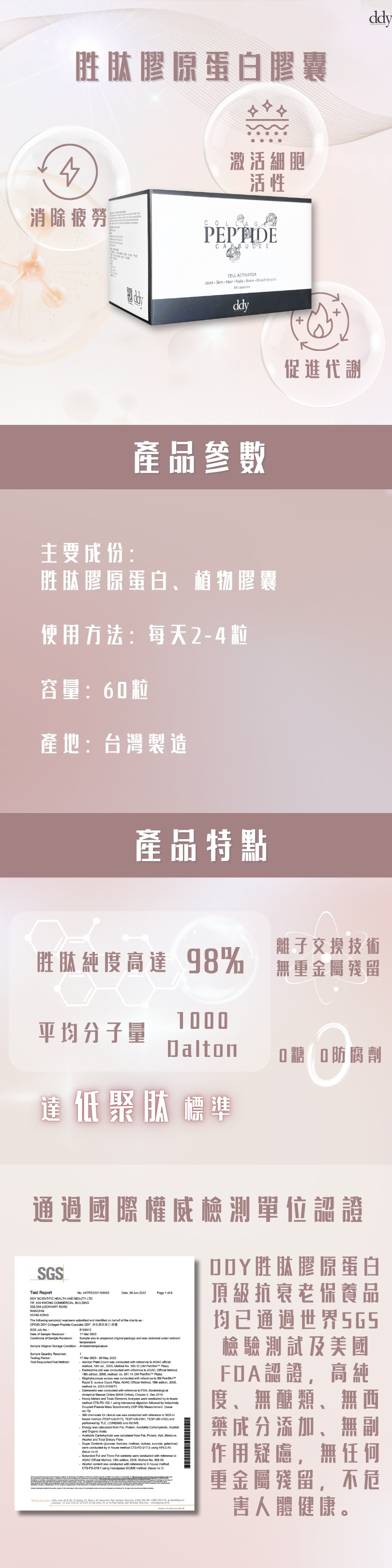 以胜肽膠原蛋白、植物萃取為主的膠囊,胜肽膠原蛋白為98%純度、虱目魚鱗萃取,平均分子量1000 Dalton達「低聚肽」標準。