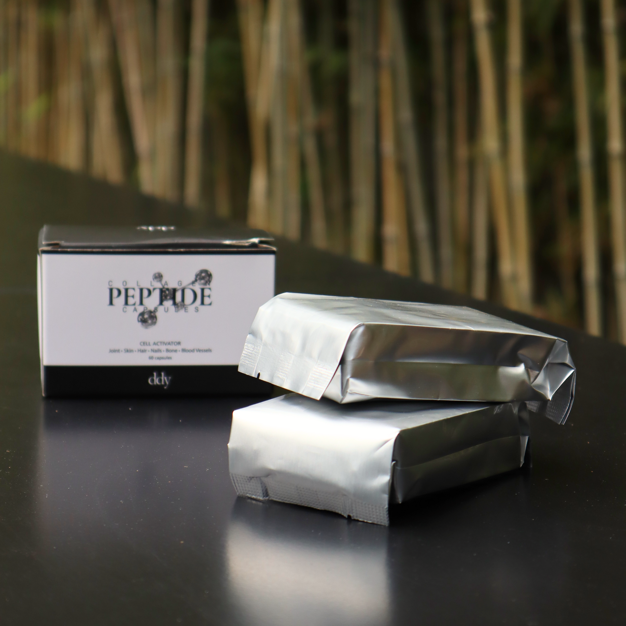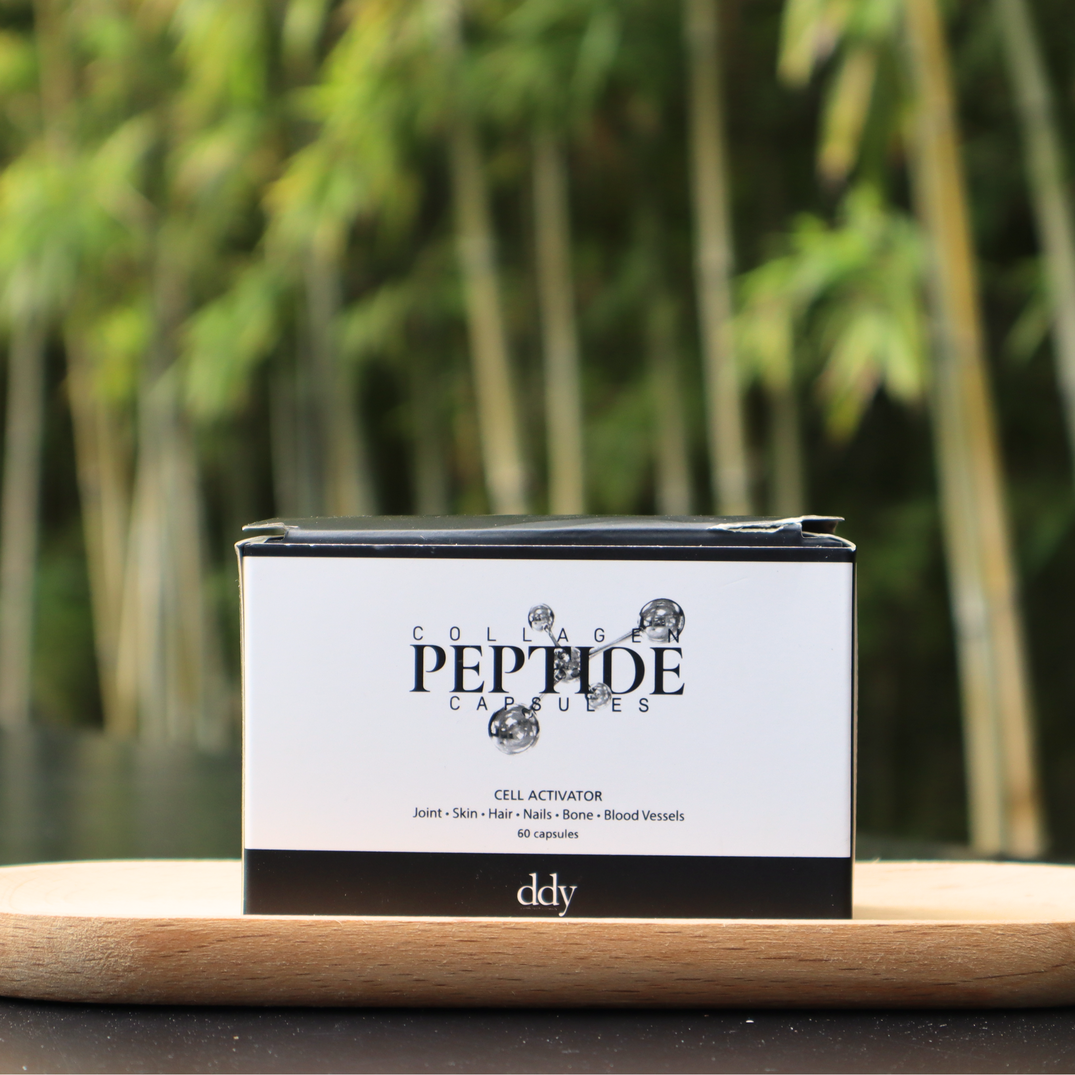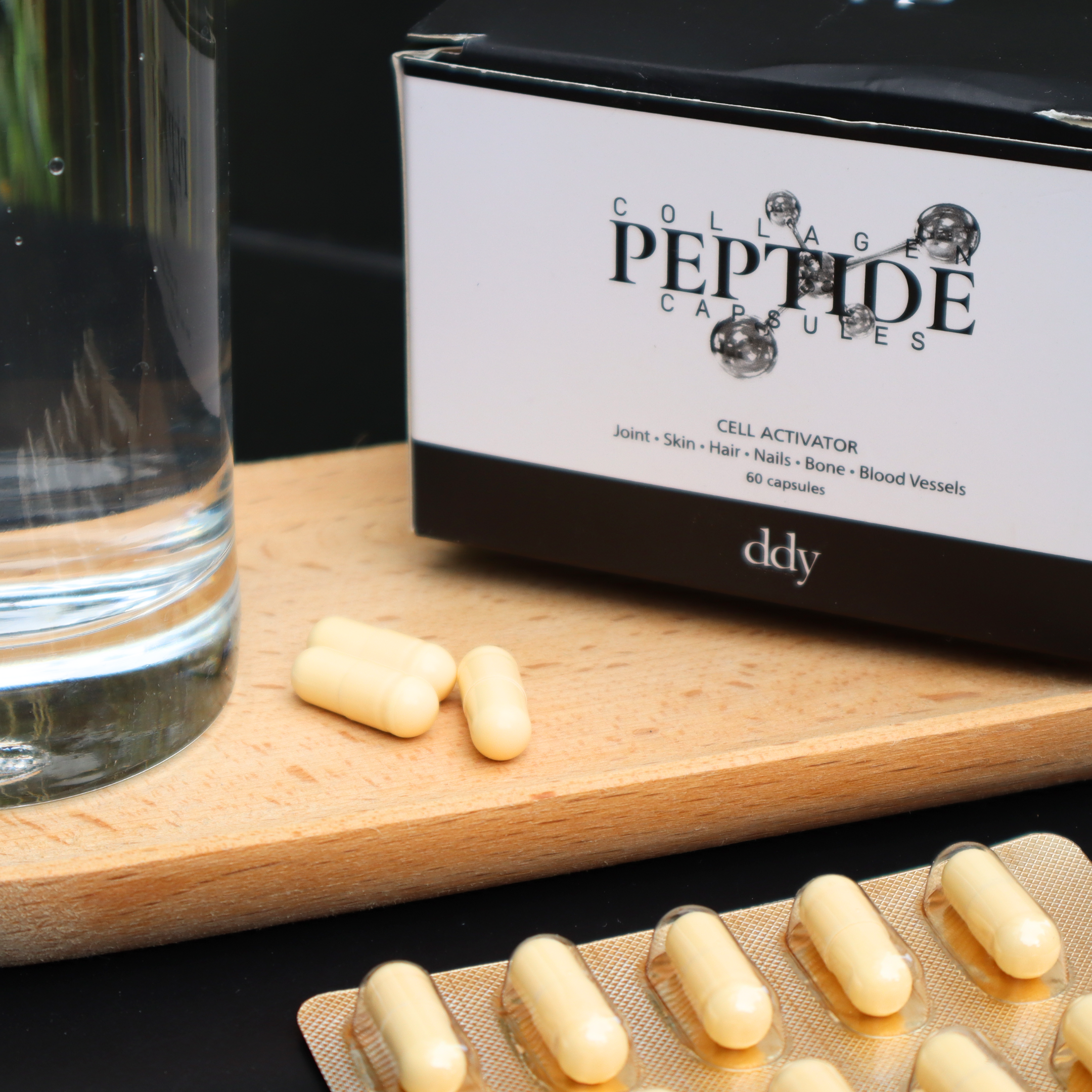 以胜肽膠原蛋白、植物萃取為主的膠囊,胜肽膠原蛋白為98%純度、虱目魚鱗萃取,平均分子量1000 Dalton達「低聚肽」標準。